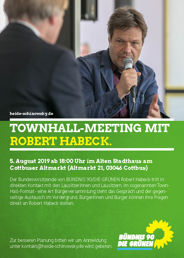 Townhall HabeckAm Montag, den 5. August, 18.00 Uhr tritt der Bundesvorsitzende von BÜNDNIS 90/DIE GRÜNEN Robert Habeck in direkten Kontakt mit den Lausitzerinnen und Lausitzern. Im sogenannten Town-Hall-Format - eine Art Bürgerversammlung steht das Gespräch und der gegenseitige Austausch im Vordergrund. Bürgerinnen und Bürger können ihre Fragen direkt an Robert Habeck stellen.