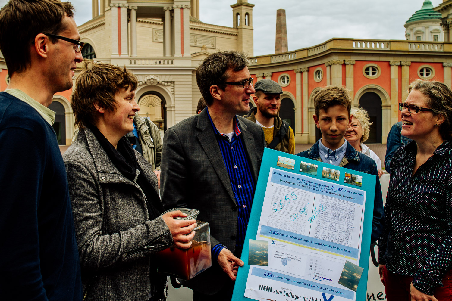 IMG_8455Als Mitglied des Petitionsausschusses hat die bündnisgrüne Landtagsabgeordnete Heide Schinowsky heute zusammen mit dem umweltpolitischen Sprecher der bündnisgrünen Landtagsfraktion Benjamin Raschke und Vertretern der CDU vor dem Brandenburger Landtag über 5000 Unterschriften gegen die Verklappung von Eisenhydroxidschlamm entgegengenommen.