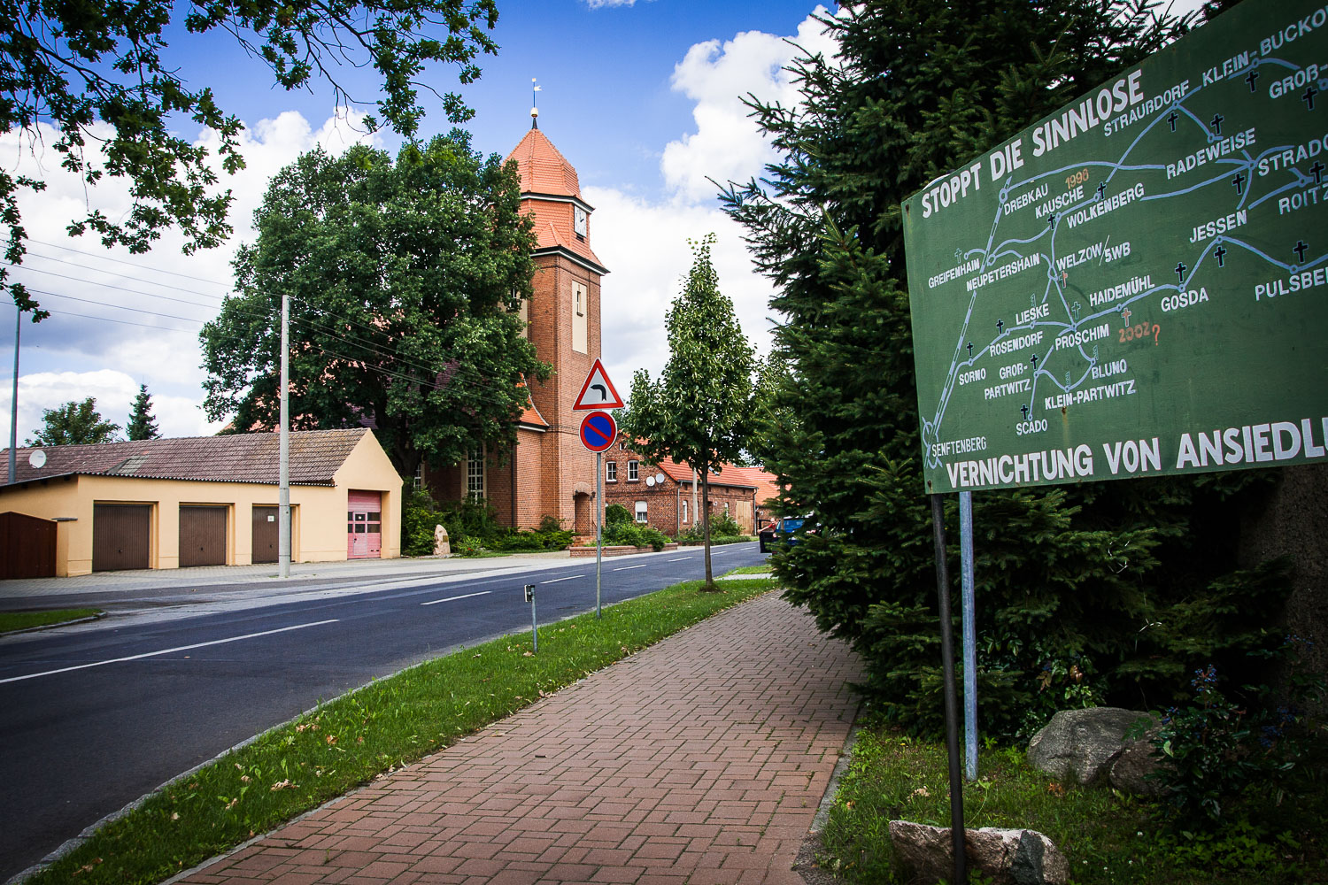 Proschim-0145Mehrere hundert Einwohner mit Unterstützung von Aktivisten wollen am Sonnabend, 20.6. ab 13.00 Uhr in dem von der Abbaggerung bedrohten Bioenergiedorf Proschim ein riesiges gelbes X mit allen Teilnehmern bilden. Das gelbe X steht in Ostdeutschland für den Protest gegen neue Tagebaue und CO2-Verpressung. Trotz Energiewende und Klimawandel halten die Landesregierungen in Sachsen und Brandenburg weiter an die Braunkohle fest: Drei Tagebauerweiterungen befinden sich aktuell im Planungsverfahren. Die Teilnehmer wollen ein Zeichen für den mittelfristigen Ausstieg aus der Braunkohle setzen. Die Aktion beginnt 12:45 Uhr mit einer Andacht mit Pfarrer Schütt in der Dorfkirche Proschim. Kantor Johannes Kapelle und die bündnisgrüne Landtagsabgeordnete Heide Schinowsky werden die Andacht musikalisch mit Orgel und Querflöte begleiten. Das Proschimer Urgestein Kapelle hatte mit einem Internet-Video "Opa ohne Lobby" im Jahr 2013 über die geplante Vertreibung aus seinem Heimatdorf wegen des drohenden neuem Tagebau bundesweit Aufmerksamkeit erregt.