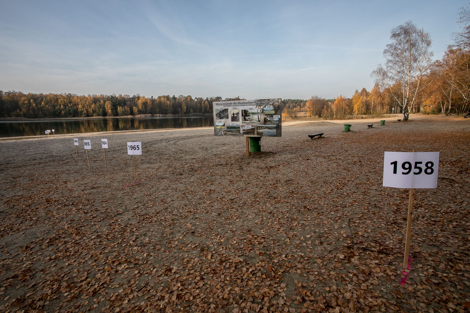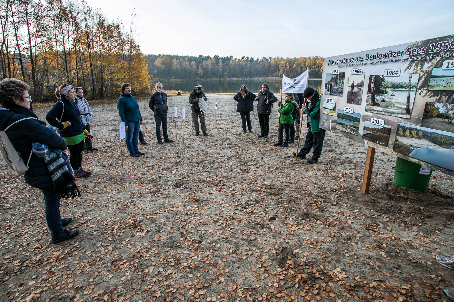 Mehr als 50 Meter hat sich das Wasser am Hauptstrand des Deulowitzer Sees bereits zurückgezogen. Ursache hierfür ist insbesondere der näherrückende Tagebau Jänschwalde. Anlässlich der Ankunft der Klimapilger am Sonnabend verdeutlichte Matthias Bärmann von der evangelischen Kirchengemeinde Guben mit einer Reihe von Fotos und Wegmarken am Strand von 1958 bis heute den massiven Wasserrückgang.