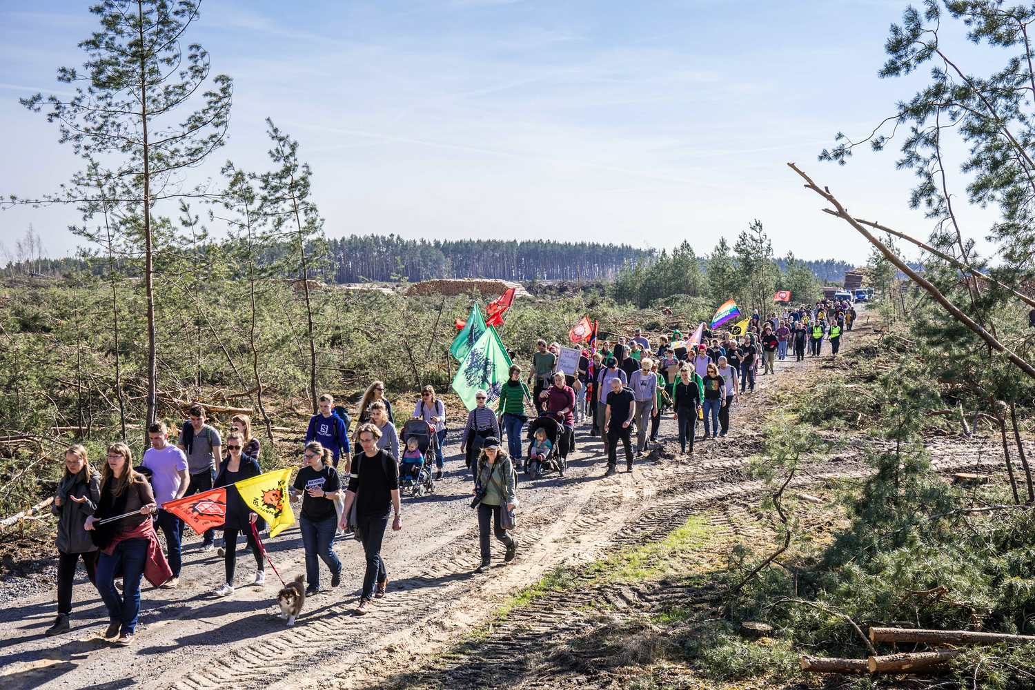 Über 250 Teilnehmer begleiteten heute einen Waldspaziergang der Grünen Liga am Rand des Tagebaus Jänschwalde. Ziel der Wanderung durch bereits abgeholztes Gelände war ein Waldstück, das von Enteignung für den tschechischen Braunkohlebergbaubetreiber LEAG bedroht ist.